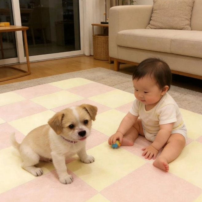 素材自体が優れた断熱材で、地面の冷気(特に冬やエアコンの効いた部屋)を効果的に遮断し、長時間地面で遊んだり休んだりする子供やペットに暖かい接触面を提供し、腹部の冷えを防ぎます。
